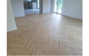 Chantier Bron. Réparations d'un parquet 23mm massif chêne cloué, reprise au ragréage pour la mise à niveau fourniture et pose cloué de lame de parquet fabriquer sur mesure