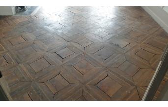 Chantier Vienne réparation d'un parquet mosaïques en 3 essences de bois, ponçage et vitrification 3 couches de vernis polyuréthane satiné